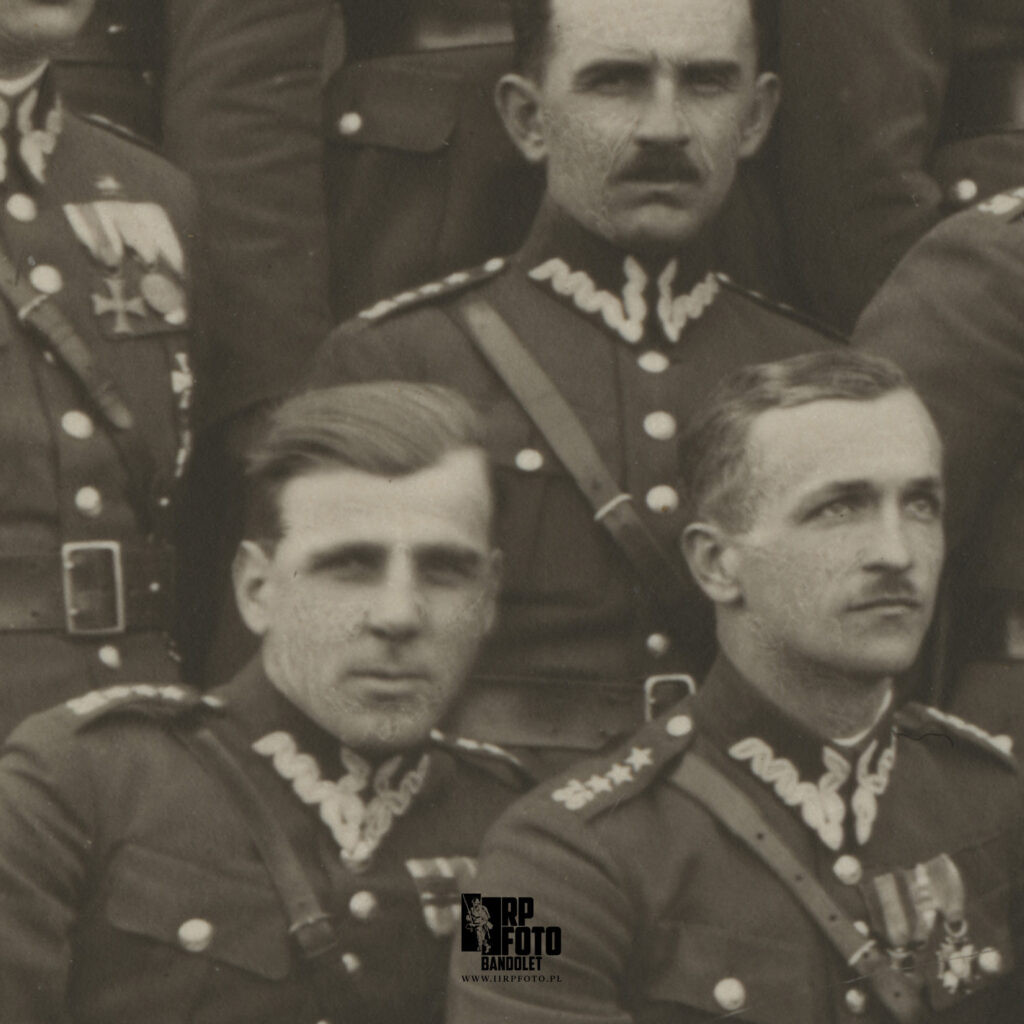 przybliżenie, widoczni podporucznik Józef Kuropieska, porucznik Jan Kazimierz Kasprzycki, porucznik Stanisław Pikoń, porucznik Stefan Ostaszewski II, porucznik Michał Gawryś, porucznik Ignacy Wieliczko, kapitan Stefan Korzeniowski, porucznik Jan Bratkowski, porucznik Kazimierz Chojnowski, kapitan Henryk Marian Królikowski, kapitan Stefan Pomarański, major Łado Siamiaschwili