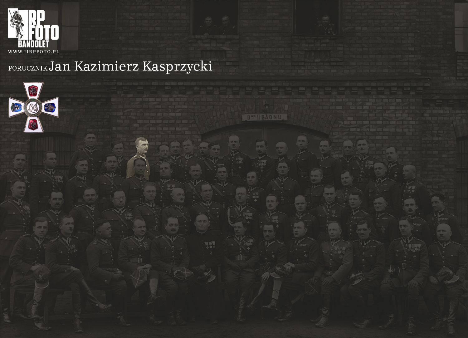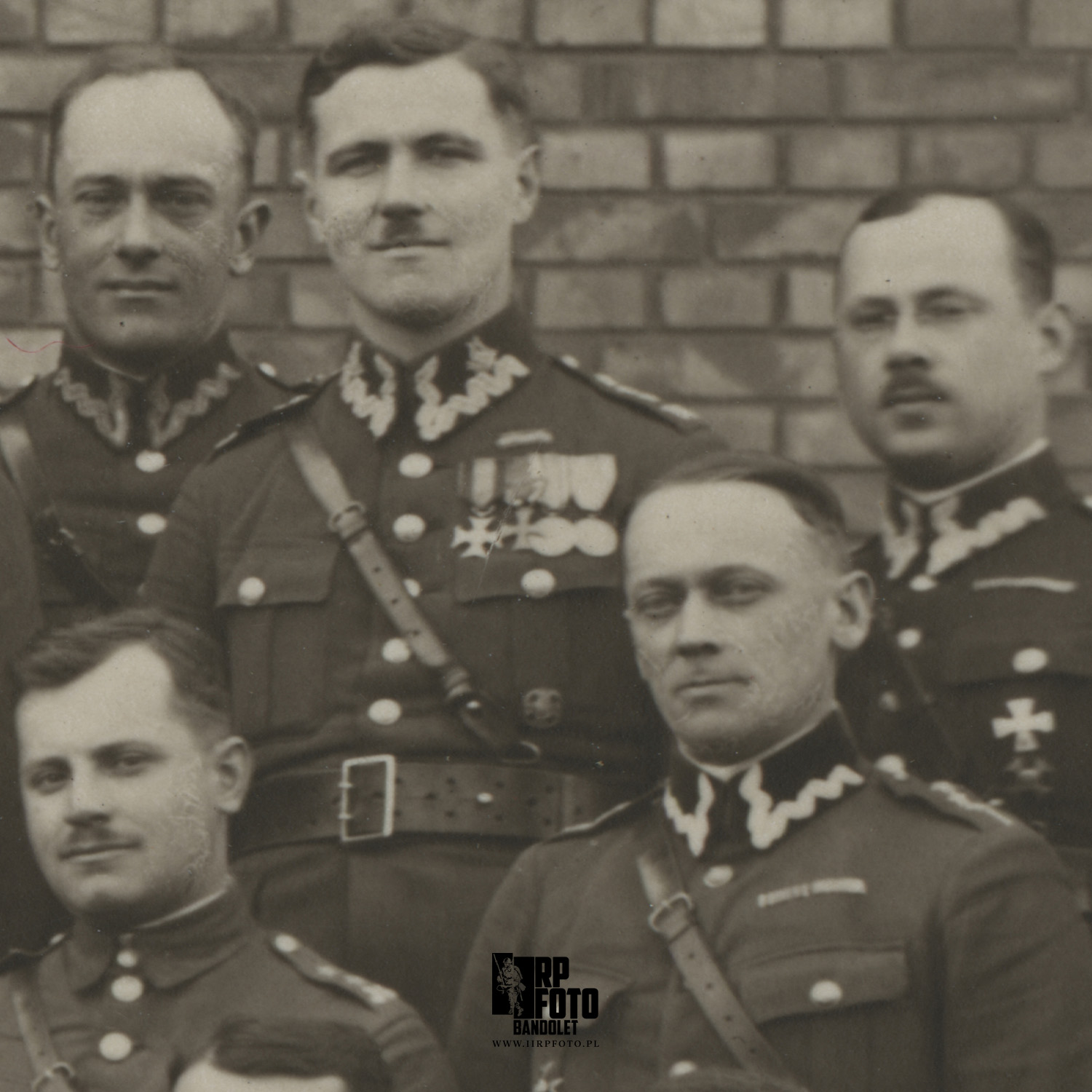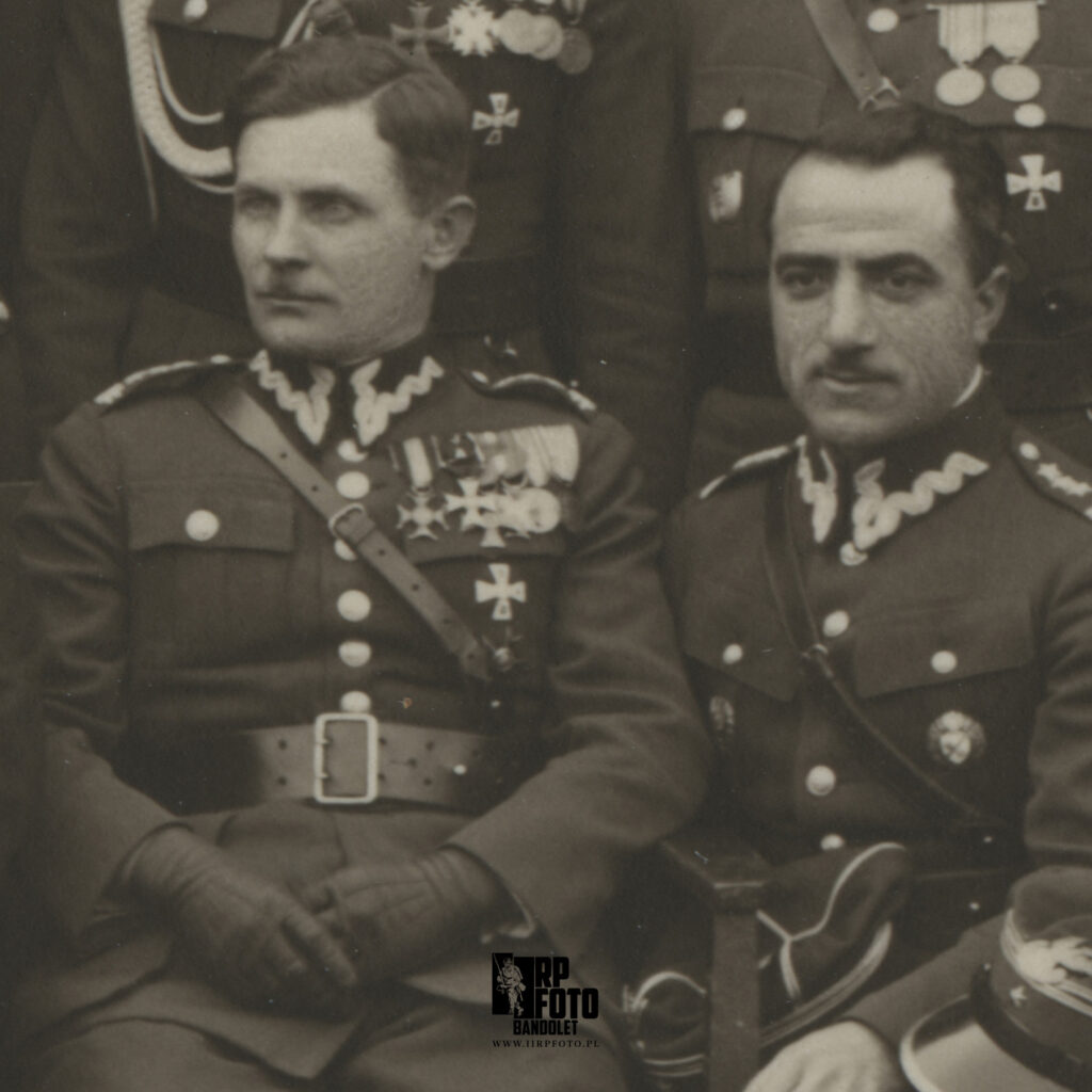 przybliżenie, widoczni podporucznik Józef Kuropieska, porucznik Jan Kazimierz Kasprzycki, porucznik Stanisław Pikoń, porucznik Stefan Ostaszewski II, porucznik Michał Gawryś, porucznik Ignacy Wieliczko, kapitan Stefan Korzeniowski, porucznik Jan Bratkowski, porucznik Kazimierz Chojnowski, kapitan Henryk Marian Królikowski, kapitan Stefan Pomarański, major Łado Siamiaschwili