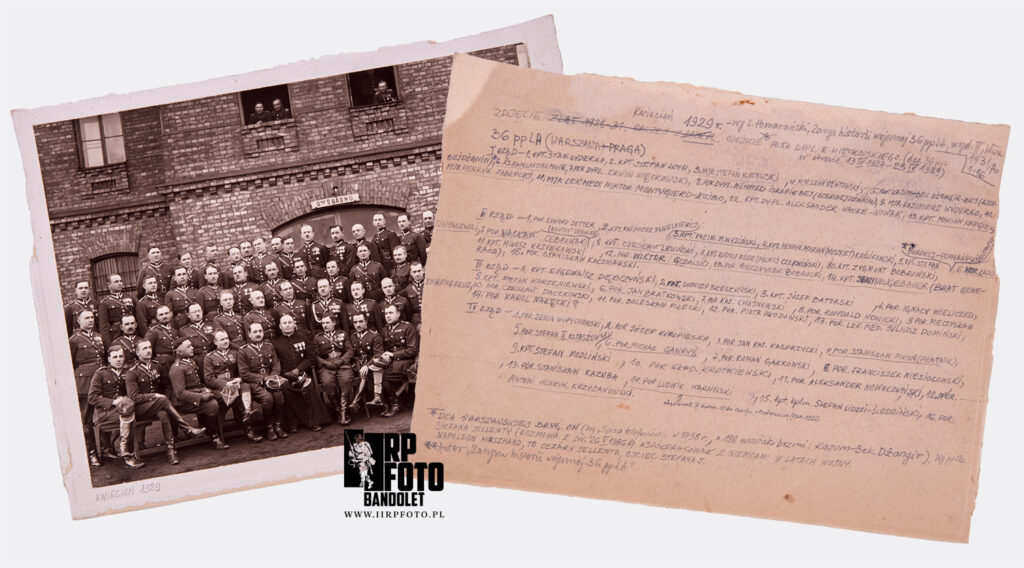 Fotografia na rewersie posiadała wykaz wszystkich oficerów w tym siódemki brakujących. Na jej podstawie wyszło, iż popełniłem błąd w przypadku trzech oficerów z pierwotnego mojego rozpoznania. Opis na rewersie wykonany jest ołówkiem, sądząc po zapiskach pod koniec lat 80tych XX wieku. Mimo tego opis jest w mojej opinii w 100% poprawny, znajdują się też odniesienia do rozmowy odbytej przez autora opisu z jednym z oficerów pułku, Stefanem Jellentą. Personalia oficerów naniesione zapewne na podstawie jego identyfikacji.