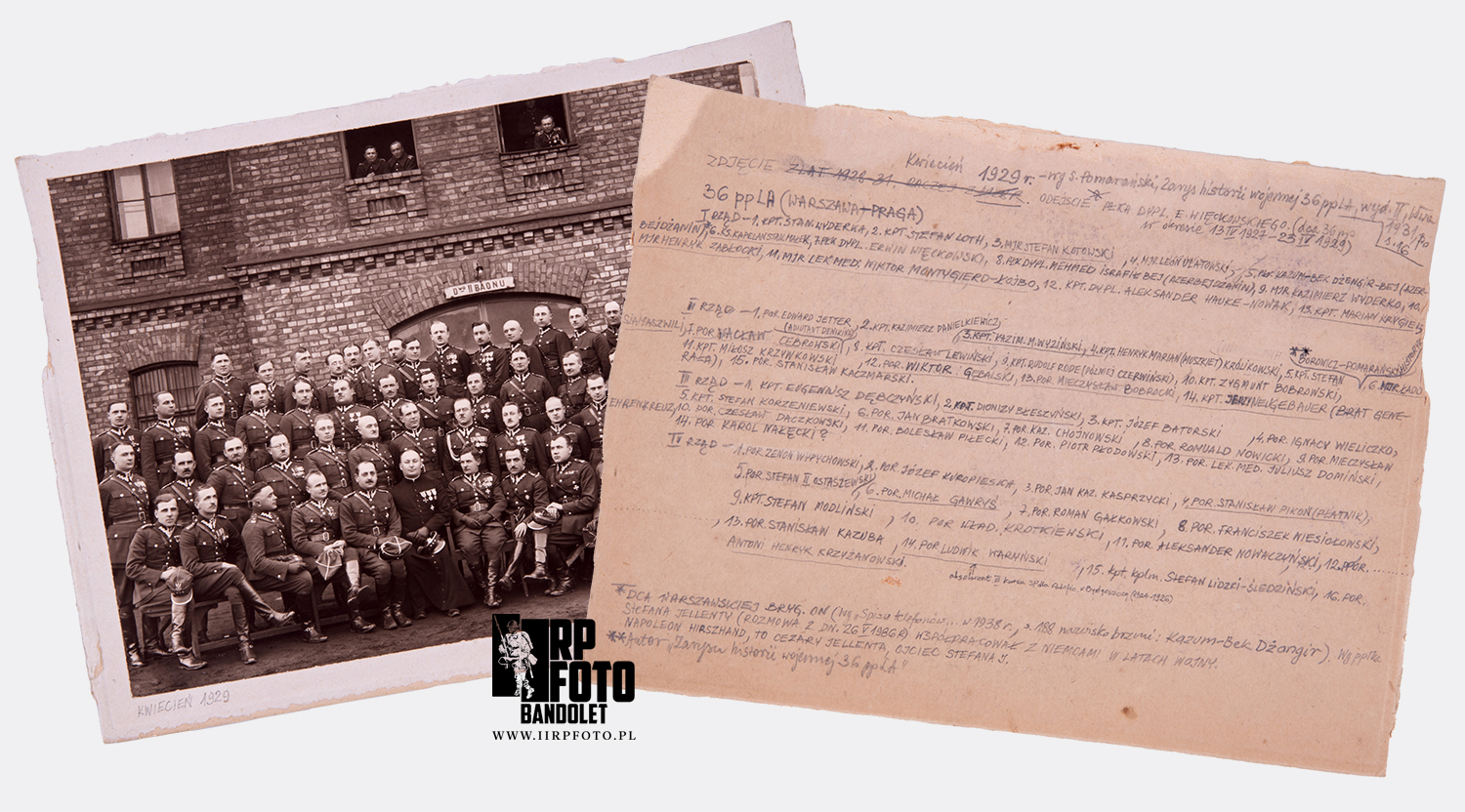 Zbieranie fotografii ze względu na to co przedstawiają, na sam walor artystyczny, ma niebywały plus pod postacią tworzenia dużej bazy zdjęć różnych formacji – choć zawsze starałem się pozostawać wiernym piechocie. To z kolei daje możliwość wchodzenia w interakcję z innymi kolekcjonerami w formie wymiany, czy to za inne ciekawe fotografie, czy też za konkretne pułki, które się zbiera bardziej niż inne. W moim przypadku to opisywany dziś 36, ale też i 21 Warszawski Pułk Piechoty.  Często daję znać różnym kolekcjonerom, że posiadam coś z ich ‘podwórka’ i z chęcią się wymienię za fotografie tych dwóch pułków. Czasem nic z tego nie wychodzi i rozmowa kończy się na standardowej kurtuazji ‘będę pamiętał, będę szukał’ a czasem potrafi obrodzić hojnie. Będąc w kropce i tracąc nadzieję na szybkie ustalenie brakujących nazwisk wydarzyła się miła niespodzianka. Skontaktował się ze mną jeden z kolekcjonerów. Wspominając naszą rozmowę na temat posiadanych przeze mnie fotografii 7 Pułku Piechoty Legionów, zapytał czy może posiadam ładną fotografię grupową oficerów 36 pułku, bo on takową trafił. Pomyślałem sobie „wow”, nieźle, może dzięki niej uda mi się kogoś nowego ustalić zważywszy iż na rewersie podobno są nazwiska. Od słowa do słowa i podesłał mi zdjęcie tej fotografii…jakie było moje zaskoczenie i ekscytacja, kiedy okazało się, że to jest ta sama fotografia jedynie wycięta z kartonika! Z opisami na rewersie! Dosyć sprawnie ustaliliśmy wymianę, spotkaliśmy się osobiście, i jak to zawsze w takich sytuacjach bywa – tematów do rozmowy było więcej niż czasu. Tutaj podziękowania dla Artura Majchera!